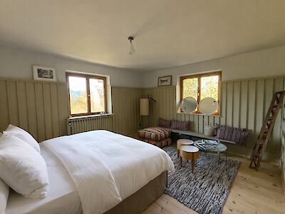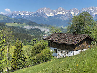 The property is situated in an absolutely unobstructed, quiet, and sunny location at the foot of the Kitzbühel Horn. It currently comprises two apartments, each with a living room and kitchen, as well as one or two bedrooms with a bathroom and toilet. The house has a full basement. An extension, as shown in the visualization, has been presented to the local council, but there is no approval yet for its construction. The plans include a large living room with an open-plan kitchen, four bedrooms, each with its own bathroom, and a utility room.