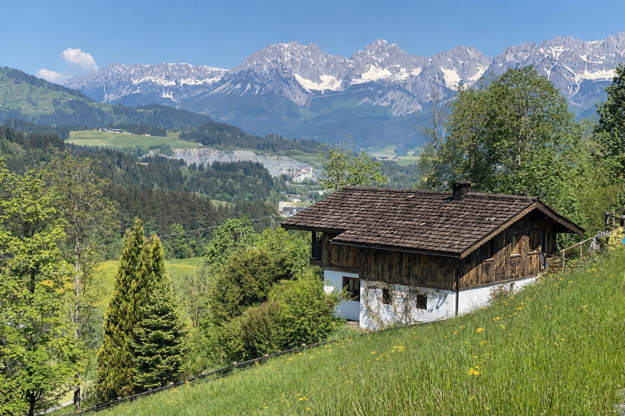 The property is situated in an absolutely unobstructed, quiet, and sunny location at the foot of the Kitzbühel Horn. It currently comprises two apartments, each with a living room and kitchen, as well as one or two bedrooms with a bathroom and toilet. The house has a full basement. An extension, as shown in the visualization, has been presented to the local council, but there is no approval yet for its construction. The plans include a large living room with an open-plan kitchen, four bedrooms, each with its own bathroom, and a utility room.
